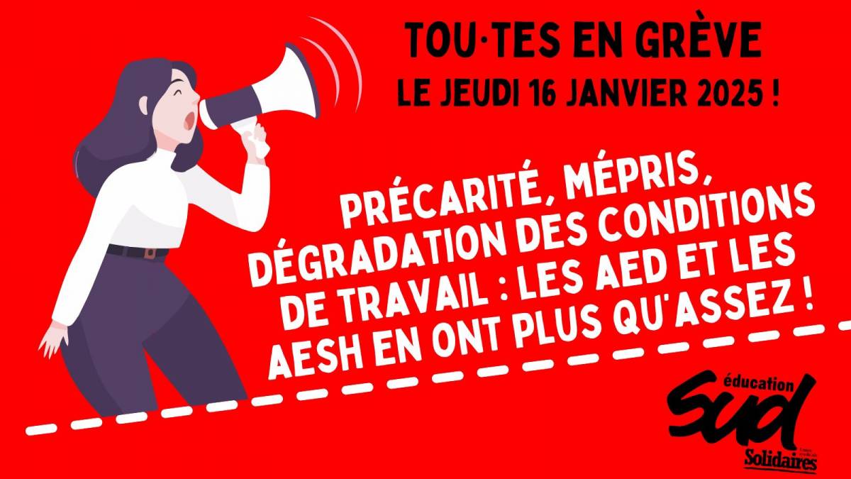 SUD éducation Paris appelle les assistant⋅es d’éducation (AED, AP, APS), les AESH ainsi que l’ensemble des personnels à se mettre massivement en grève le jeudi 16 janvier 2025 contre la précarité dans l’éducation nationale.