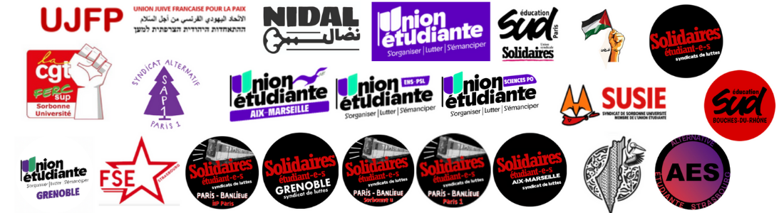 Signataires : NIDAL, Union Juive française pour la Paix, Union étudiante, Solidaires Étudiant.e.s, Sud éducation Paris, Sud éducation Bouches du Rhône, Syndicat Alternatif Paris 1, Students For Justice in Palestine Science Po, Union Étudiante Science Po, Union étudiante AM, Union étudiante ENS-PSL, Union Étudiante Grenoble, SUSIE, Solidaires Étudiant.e.s Paris 1 (SESL Paris 1), SESL Sorbonne Université, SESL Science Po Paris, SESL Aix Marseille, SESL Grenoble, FSE Strasbourg, Comité Palestine Unistras, Alternative Étudiante Strasbourg, CGT Ferc Sup Sorbonne Université