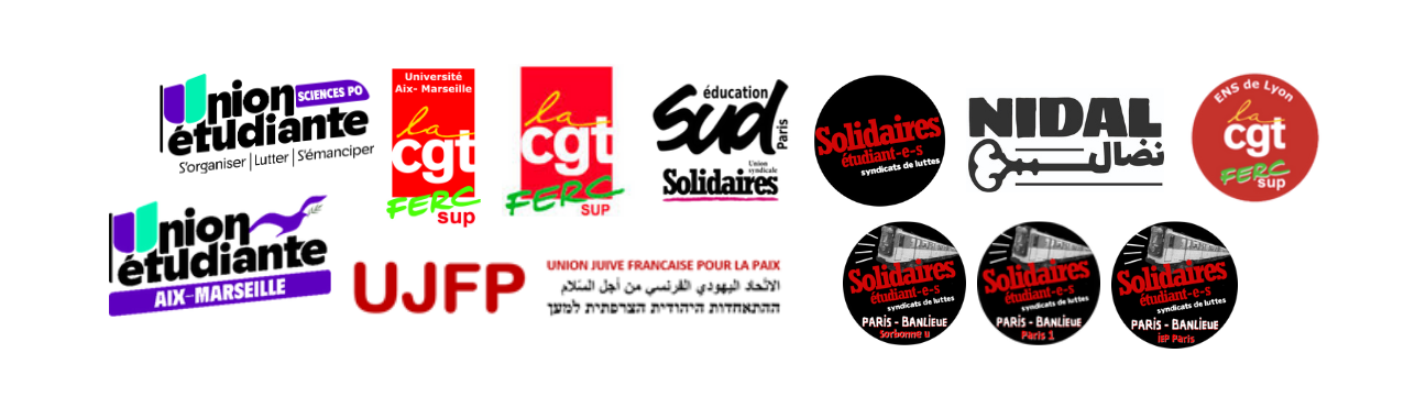 Signataires : NIDAL, Union Juive française pour la Paix, Union étudiante, Solidaires Étudiant.e.s, Sud éducation Paris, Sud éducation Bouches du Rhône, Syndicat Alternatif Paris 1, Students For Justice in Palestine Science Po, Union Étudiante Science Po, Union étudiante AM, Union étudiante ENS-PSL, Union Étudiante Grenoble, SUSIE, Solidaires Étudiant.e.s Paris 1 (SESL Paris 1), SESL Sorbonne Université, SESL Science Po Paris, SESL Aix Marseille, SESL Grenoble, FSE Strasbourg, Comité Palestine Unistras, Alternative Étudiante Strasbourg, CGT Ferc Sup Sorbonne Université