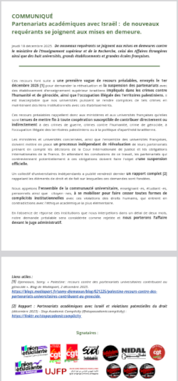 [1] Djemaoun, Samy. « Palestine : recours contre des partenariats universitaires contribuant au génocide ». Blog de Mediapart, 2 décembre 2025.