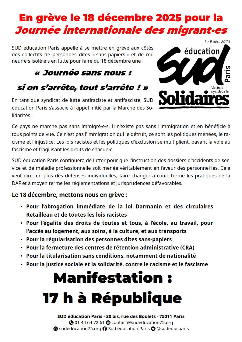 SUD éducation Paris est signataire de l'appel à la Journée sans nous du 18 décembre 2025, retranscrit ci-dessous.