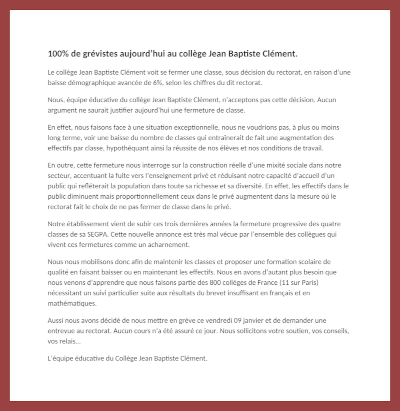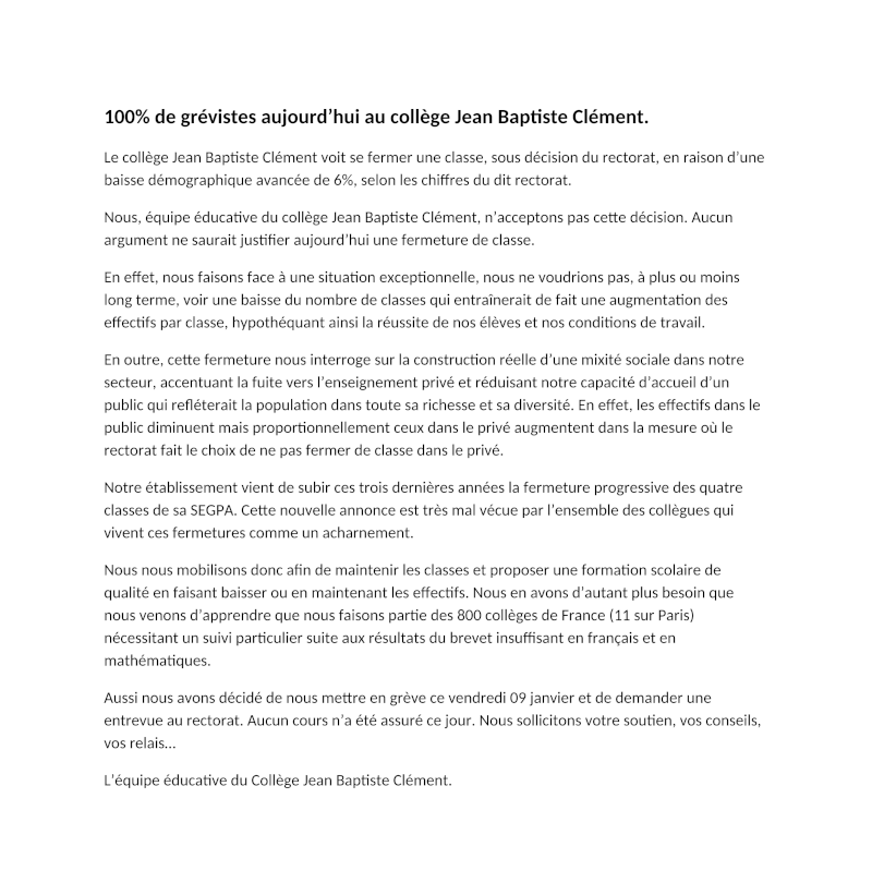 Nous, équipe éducative du collège Jean Baptiste Clément, n’acceptons pas cette décision. Aucun argument ne saurait justifier aujourd’hui une fermeture de classe.