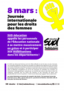 SUD éducation appelle à se mettre en grève le 8 mars et à participer massivement à toutes les initiatives et mobilisations.