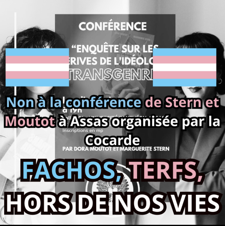 Pour rappel, la transphobie et l'homophobie sont des délits punis par la loi, l'existence des personnes trans n'est pas un point de vue et n'a pas a être débattue ! Nous ne pouvons accepter que ces deux militantes réactionnaires puissent propager leur idéologie à l'université d'Assas.