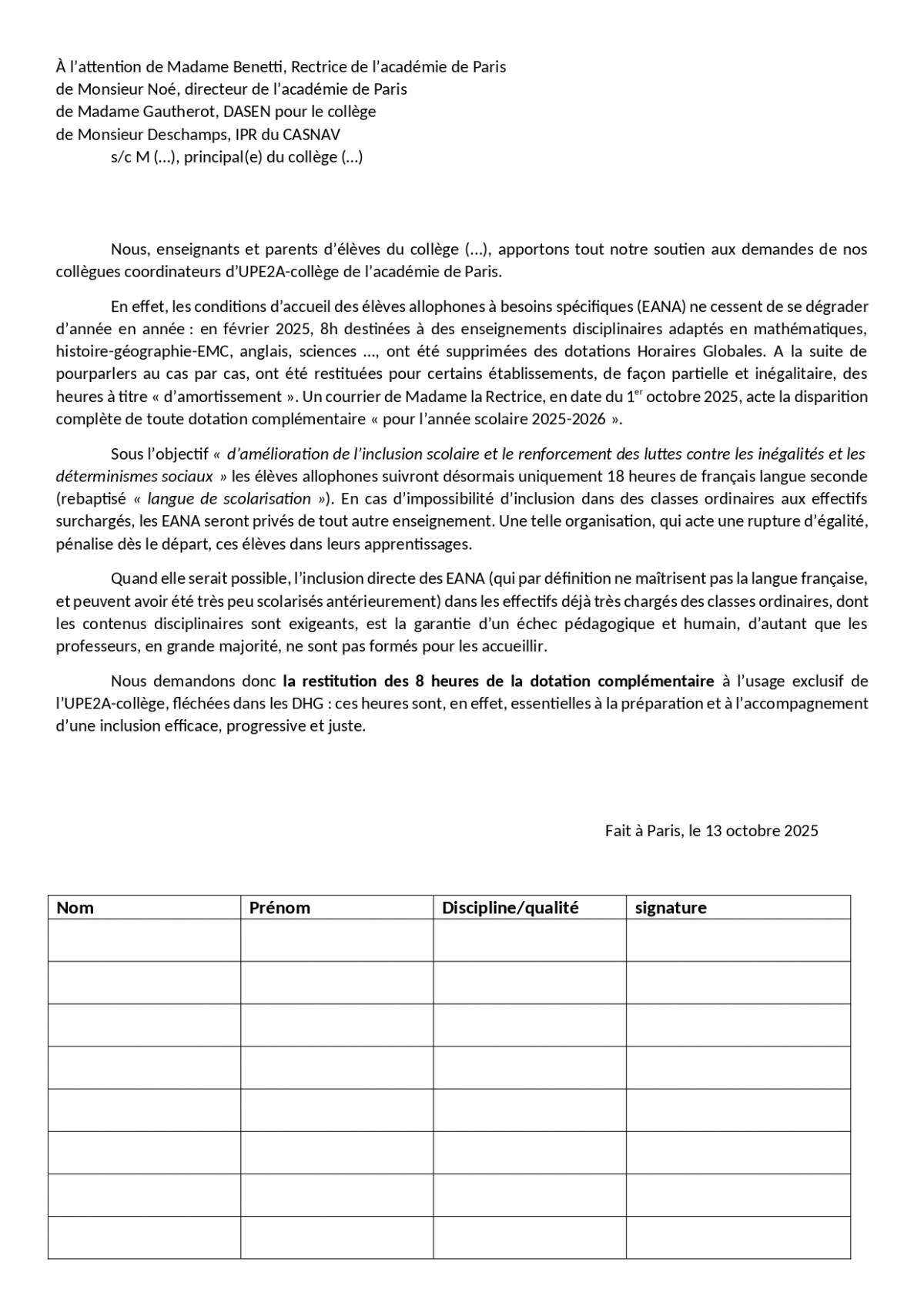 Nous, enseignants et parents d’élèves du collège (...), apportons tout notre soutien aux demandes de nos collègues coordinateurs d’UPE2A-collège de l’académie de Paris.
